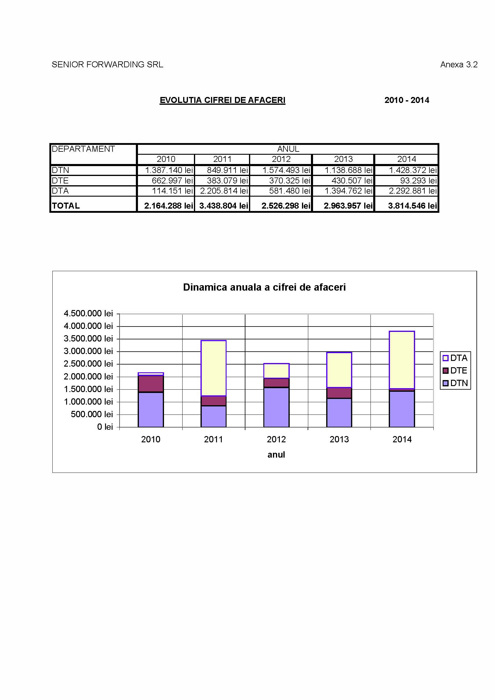Asa cum se poate observa din tabelul si graficul de mai jos, cifra de afaceri a societatii in perioada 2010 - 2014 prezinta o tendinta crescatoare. In anul 2011 a inregistrat un salt cu mult peste rata medie de crestere care s-a datorat unor contracte importante realizate de catre departamentul de transporturi agabaritice.